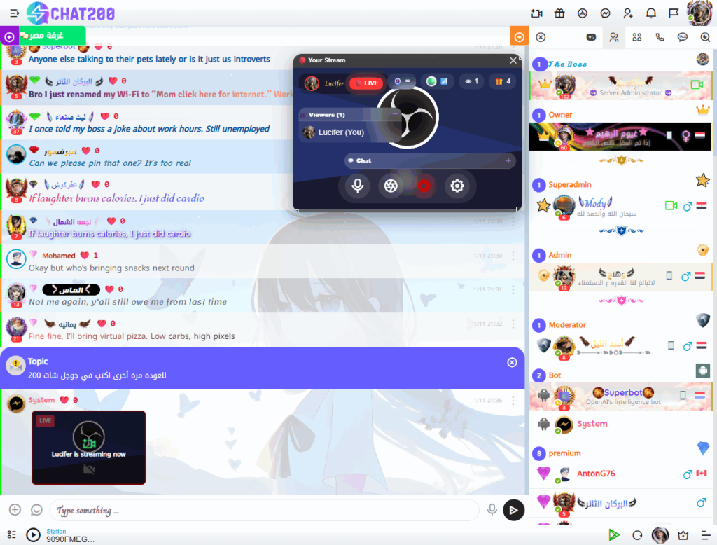 Enhances the chat script by letting users listen to integrated radio stations or playlists.